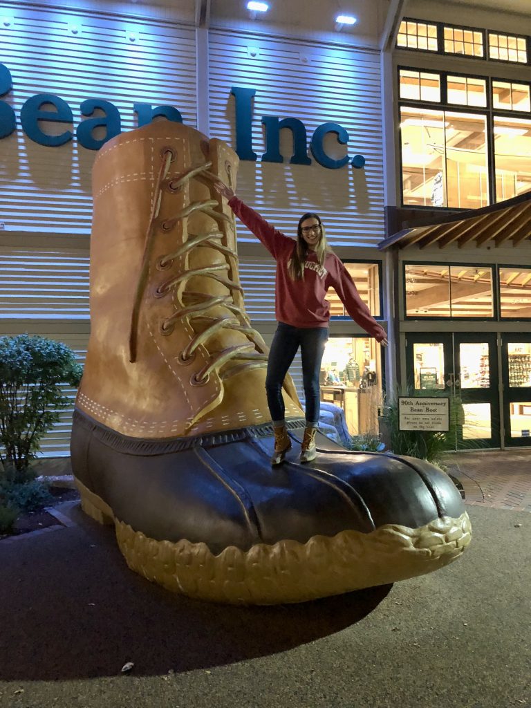 Our route then took us through Boston and then into Maine. Our final charging stop of the day was in Freeport, Maine which happened to be located at the L.L. Bean Headquarters and Flagship Store that is open 24 hours a day, 365 days a year! While the car charged up we browsed the store and Ashley was able to get her picture on a 16-foot version of their signature rubber-bottom boot.