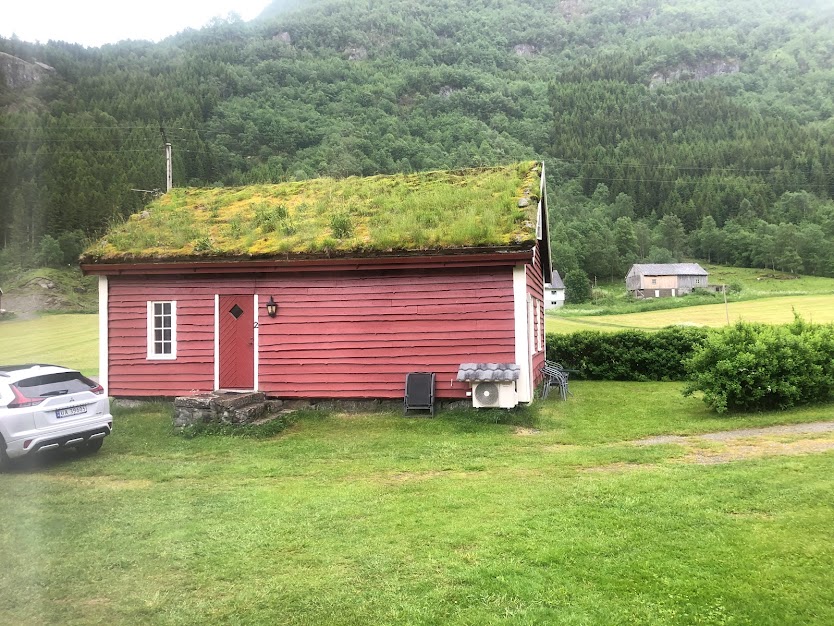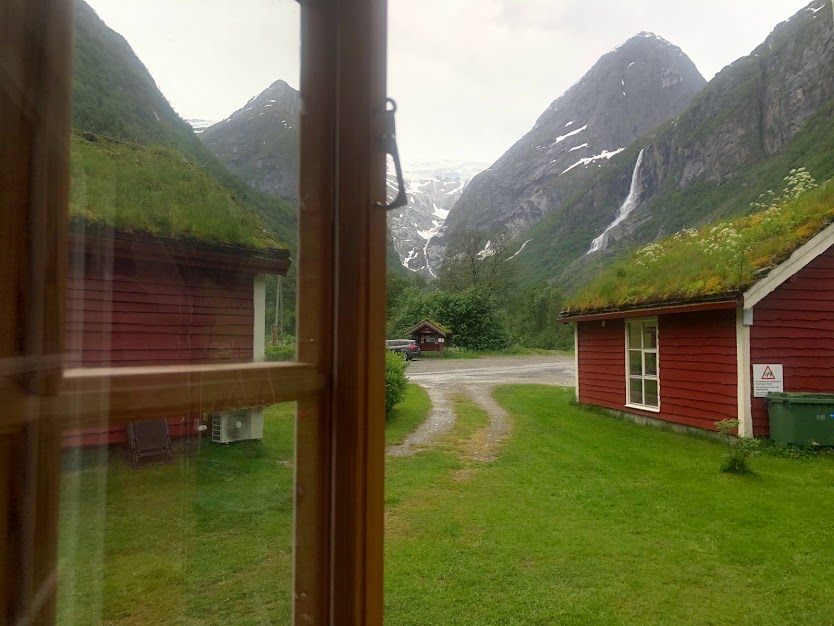 After arriving in Briksdalsbre we found our grass roof cabin at Trollbu Aabrekk Gard. From the window in our cabin we had a view of the Briksdalsbreen glacier. This turned out to be one of our favorite accommodations of the trip.