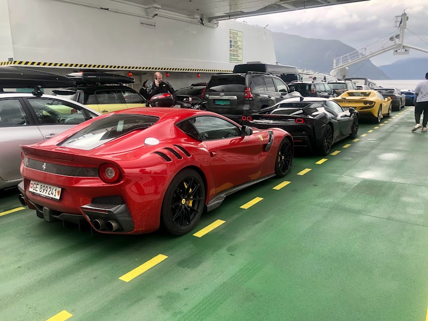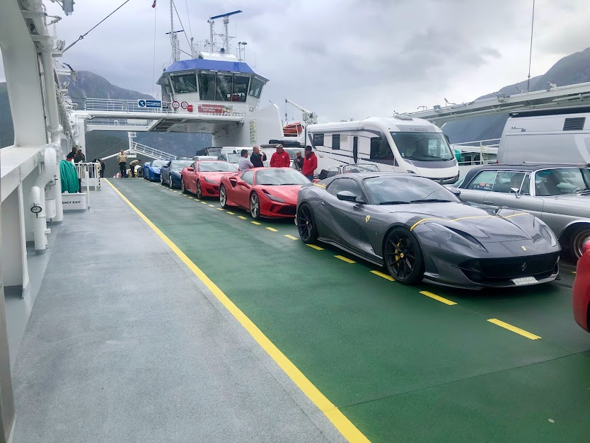 Shortly after surfacing from the tunnel we rode the Mannheller ferry to cross the next fjord. We ended up on the ferry with a collection of Ferrari’s out enjoying the Norwegian roads and scenery.