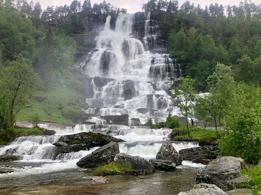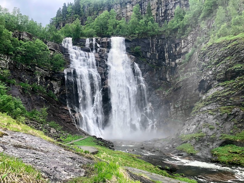 Skjervsfossen was the first of many quick stops to check out waterfalls. There was an overlook at the top of the falls and then after a short drive, there was a trail to hike up to the base of the falls below.