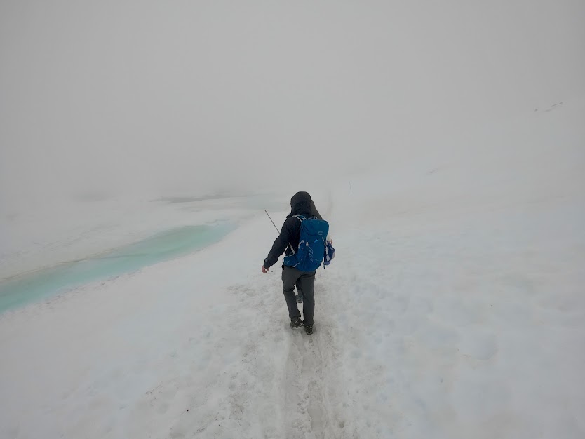 Just before 7 a.m. we started our hike up rocky terrain but it quickly turned to snow and the visibility continued to decrease we climbed higher. We hiked several miles in near white-out conditions but luckily the trail was well marked.